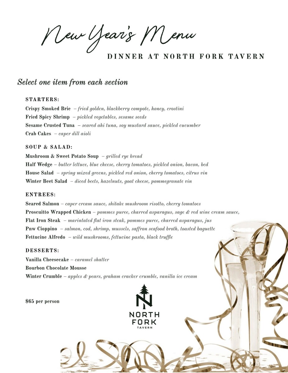 For $65 per person, indulge in a beautifully composed progression of courses, perfect for an intimate evening, a festive gathering with friends, or a memorable date night. Whether you’re toasting to new beginnings or savoring the final moments of the year, North Fork Tavern is the ideal place to celebrate.
